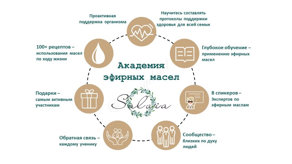 Обучение В 2020 году мы с командой создали обучающую Академию по эфирным маслам «Salvia» За 2,5 года почти 5000 человек прошли обучение в проектах Академии Выпускники получили тысячи результатов и смогли улучшить качество своей жизни Узнали сотни рецептов для решения разных задач и поддержки здоровья Что ты получишь на обучении в Академии: Вот здесь вы можете прочитать отзывы об обучении в Академии «Salvia» Хочу на обучение Что тебя ждет в нашей команде : Бесплатная Вельнесс Консультация (1,5 ч.) + Индивидуальный протокол внедрения масел в жизнь Участие во всех проектах Академии «Salvia»: Лимонный Челлендж – Интенсив 7 дней Аромашкола - 8-ми недельное обучение маслам Детокс с маслами и БАДами dōTERRA Участие в закрытом Аромаклубе, где мы продолжаем изучать масла и открывать другие темы на еженедельных вебинарах Доступ к вдохновляющему сообществу где вы сможете делиться, обмениваться опытом и обрести единомышленников Доступ к закрытым чатам в Telegramm Личностный рост и бесплатный доступ к библиотеке курсов Зарегистрироваться